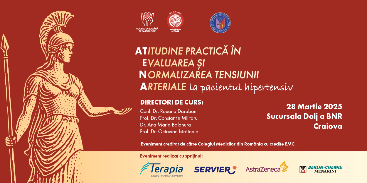 Societatea Română de Cardiologie vă invită la evenimentul „ATENA- ATitudine practică în evaluarea și normalizarea tensiunii arteriale la pacientul hipertensiv” ce se va desfășura exclusiv în format fizic, la Craiova, Sucursala Dolj a Băncii Naționale a României, în data de 28 martie 2025.