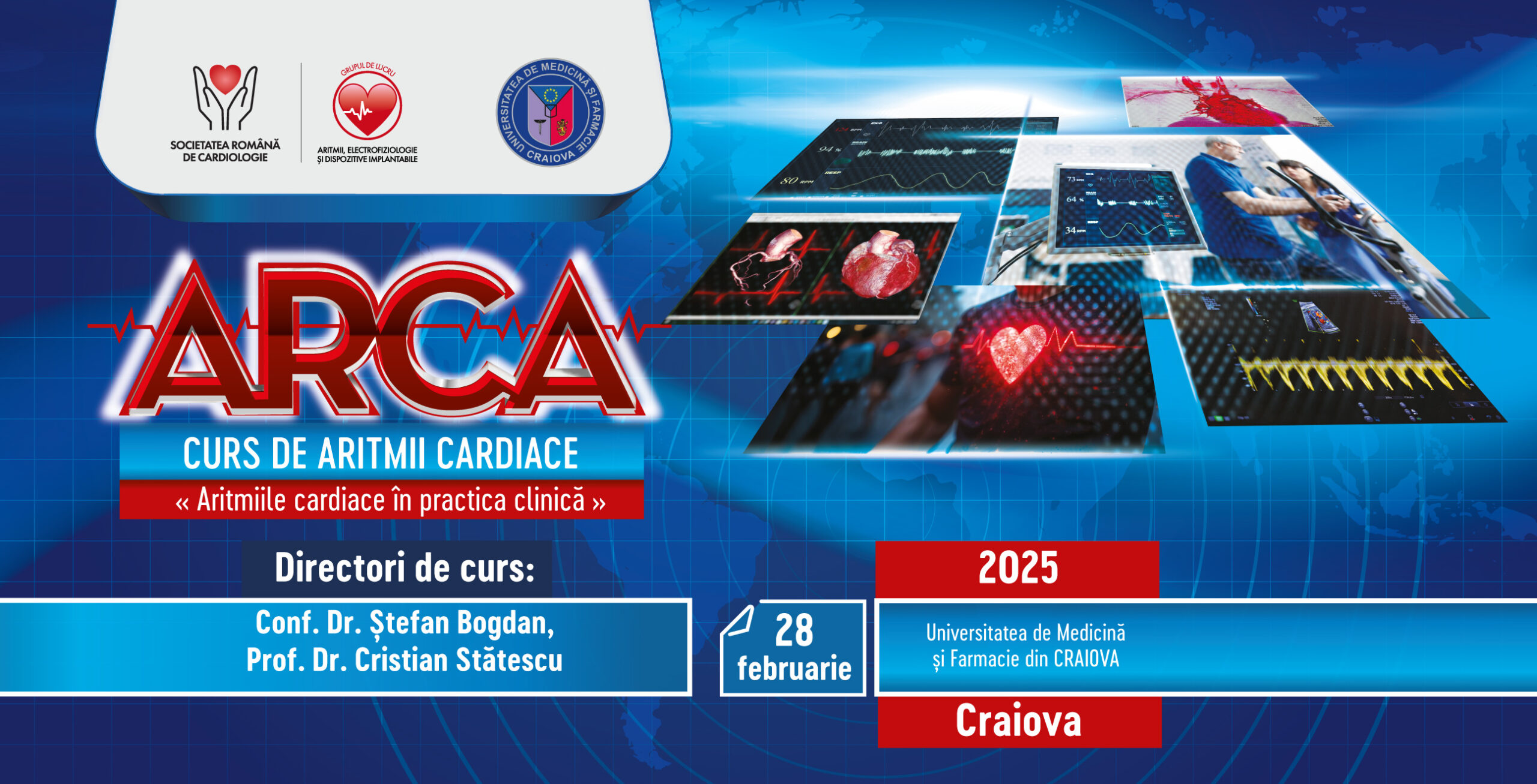 Avem deosebita plăcere de a vă invita la o nouă ediție a cursului de aritmii cardiace ARCA, ce va avea loc pe 28 februarie 2025, cu tema centrală „Aritmii cadiace în practica clinică” – o provocare majoră în practica medicală actuală.