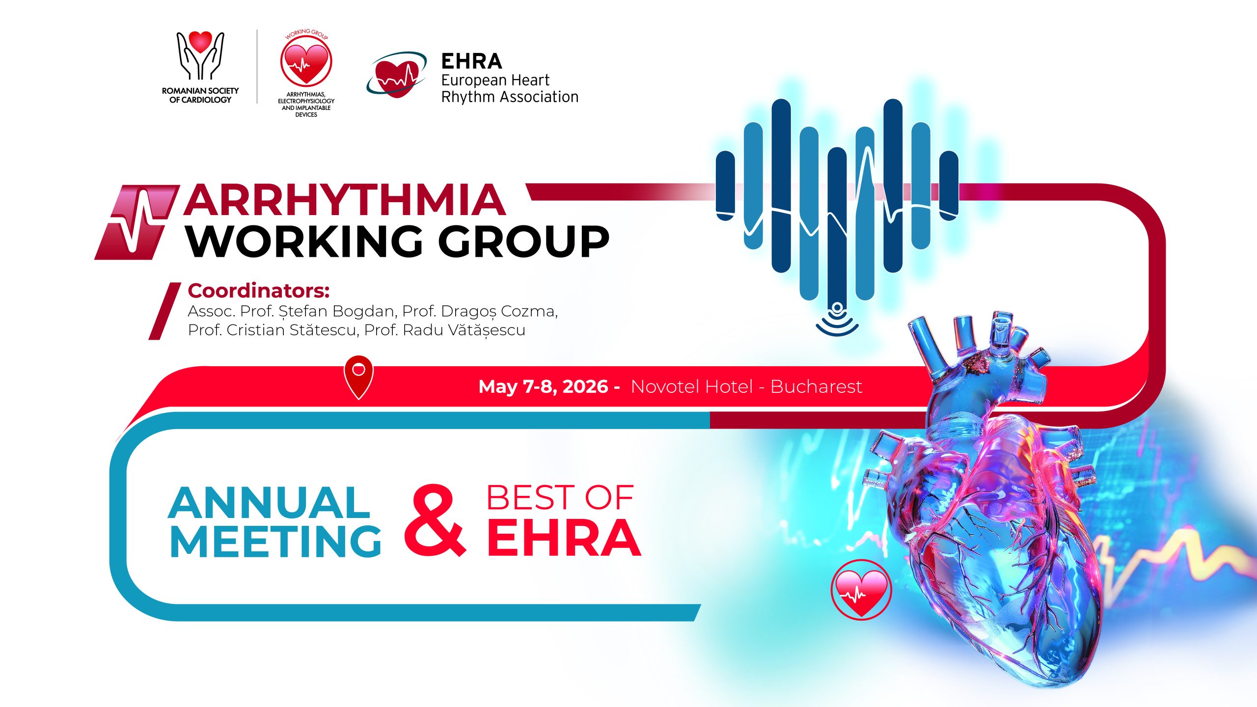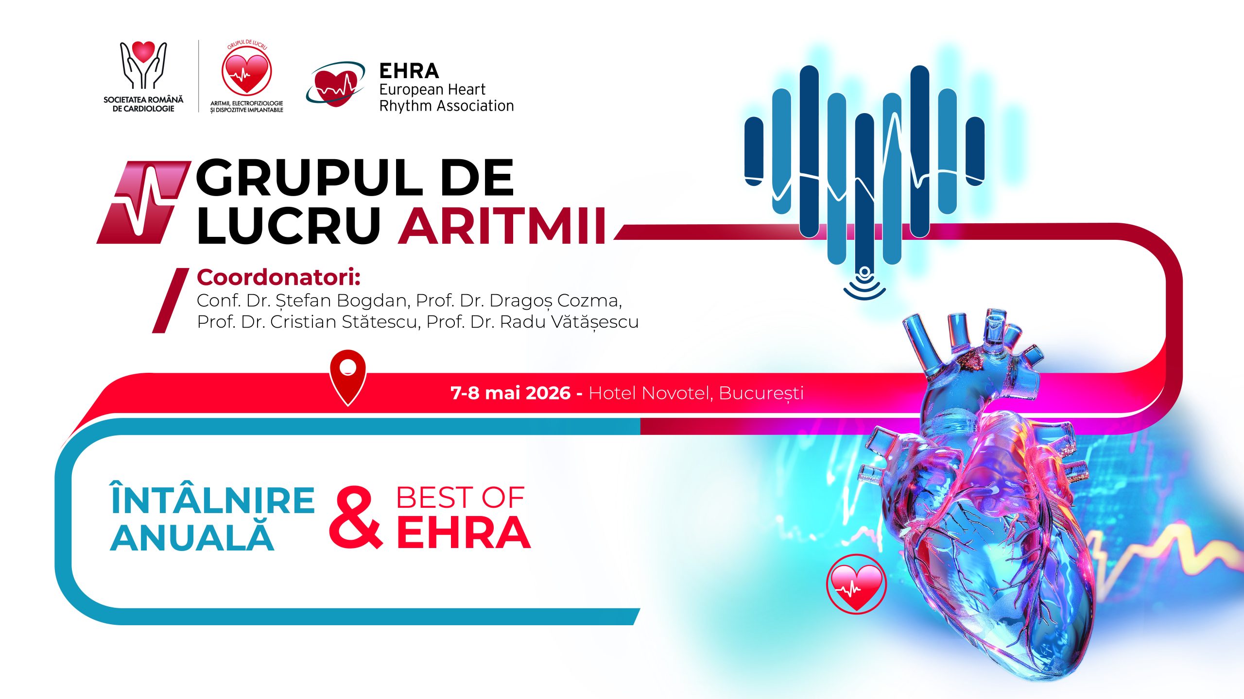 Suntem încântați să vă invităm la conferința "Întâlnirea Grupului de Lucru Aritmii & Best of EHRA". Acest eveniment, organizat de Grupul de Lucru Aritmii din cadrul Societății Române de Cardiologie, va avea loc la Hotelul Novotel din București, în perioada 7-8 mai 2026.