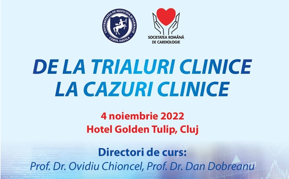Societatea Română de Cardiologie vă invită la cursul ”De la Trialuri Clinice la Cazuri Clinice” ce se va desfășura în format fizic, la Cluj Napoca, în data de 4 Noiembrie 2022.