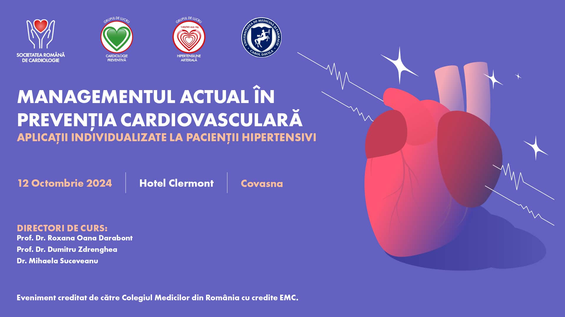Societatea Română de Cardiologie vă invită la cursul „Managementul actual în prevenția cardiovasculară” ce se va desfășura în format fizic, la Covasna, Hotel Clermont, Sala Mihai Eminescu, în data de 12 octombrie 2024.