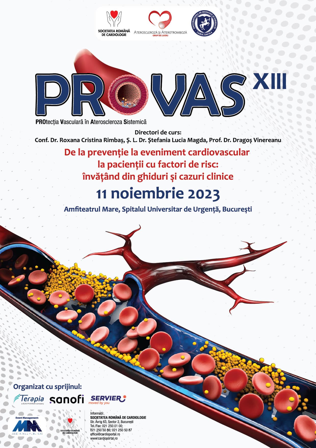 Grupul de lucru Ateroscleroză și Aterotromboză al Societății Române de Cardiologie are plăcerea de a vă invita să participați la Cursul PROVAS XIII ce va avea loc în data de 11 noiembrie 2023, în Amfiteatrul Mare din cadrul Spitalului Universitar de Urgenţă Bucureşti.