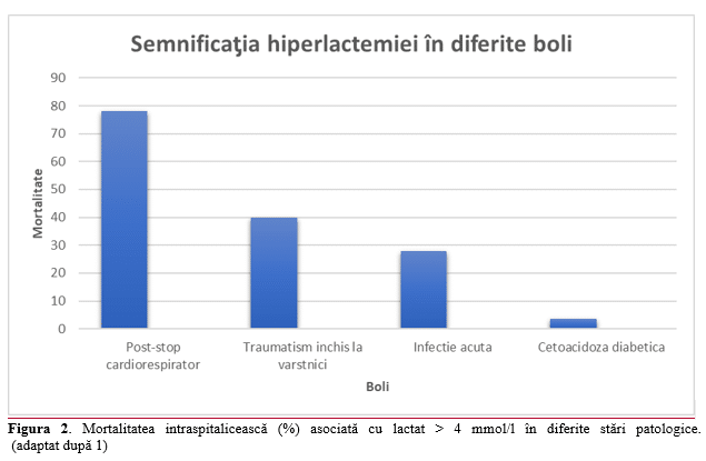 Asocierea constantă dintre lactat şi prognostic a determinat ca acesta să fie măsurat la categorii din ce în ce mai largi de pacienţi. S-a observat că lactatul este crescut în toate tipurile de şoc (relaţia clară cu prognosticul fiind aceeaşi ca în şocul cardiogen), sepsis, traumatisme, convulsii, ischemie mezenterică, arsuri, leucemie, astm bronşic, cetoacidoză diabetică sau efort muscular exagerat (febră musculară). (Figura 2) Deşi în multe dintre aceste stări lactatul seric crescut este asociat cu un prognostic mai prost, relaţia este mai puţin clară decât în şoc şi stop cardiorespirator. De remarcat că, în cetoacidoza diabetică, lactatul > 4 mmol/l nu arată un prognostic mai nefavorabil faţă de cei cu lactatul mai mic. Dealtfel, în această patologie, creşterea lactatului nu este datorată hipoperfuziei, ci alterărilor metabolice.1 Evident că hiperlactemia produsă de un efort muscular exagerat (febră musculară, astm, convulsii) nu reprezintă un indicator prognostic.