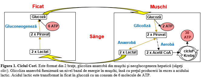 Lactatul este baza acidului lactic şi este produs în majoritatea celulelor, fiind implicat în metabolismul energetic. În mod normal, în organism există 2 sisteme prin care se generează energia: glicoliza şi fosforilarea oxidativă. Glicoliza nu necesită prezenţa oxigenului, produce o cantitate mai mică de energie şi are ca produs final lactatul. Pe de altă parte, lactatul se poate converti în piruvat (există un raport constant lactat/piruvat de 10/1), moleculă care, prin acetilcoenzima A, intră în ciclul Krebs şi iniţiază fosforilarea oxidativă ce produce energie semnificativ mai mare faţă de glicoliză.2,3 Deci, lactatul acţionează ca o placă turnantă între metabolismul anaerob şi aerob: 20% este convertit în glucoză prin neoglucogeneză în ficat (70%) şi în rinichi (30%) – metabolism anaerob, 50% este folosit local ca sursă de energie prin metbolism aerob, iar restul rămâne în sânge ca rezervă de energie.2,4 Producţia lactatului în muşchi şi metabolizarea lui în ficat şi rinichi formează ciclul Cori. (Figura 1)