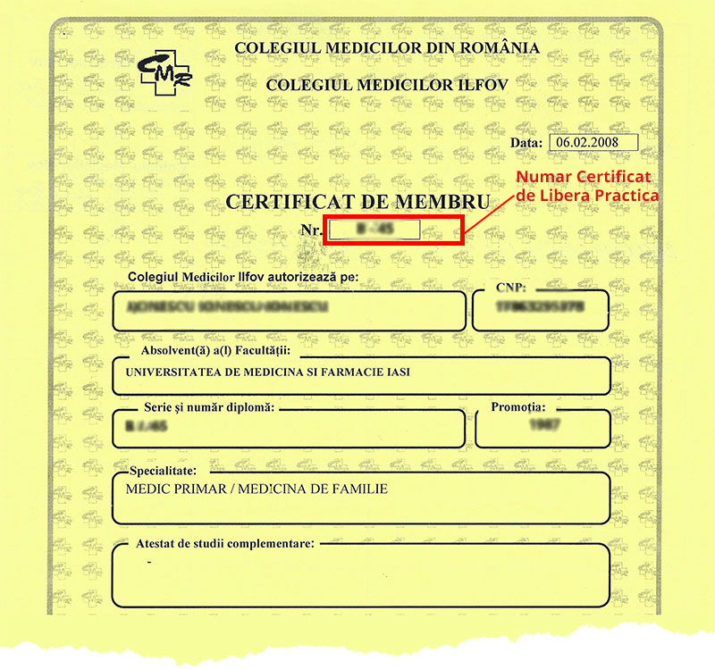 Daca Certificatul Dumneavoastra de Libera Practica avizat la zi NU contine CUIM, va rugam ca in acest camp sa specificati numarul Certificatului de Libera Practica, asa cum gasiti in imaginea de mai jos.
