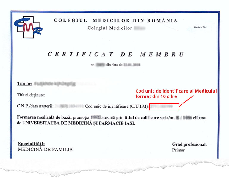 Codul Unic de Identificare al Medicului se gaseste pe Certificatul de Libera Practica emis de CMR, pe pozitia din imaginea de mai jos.