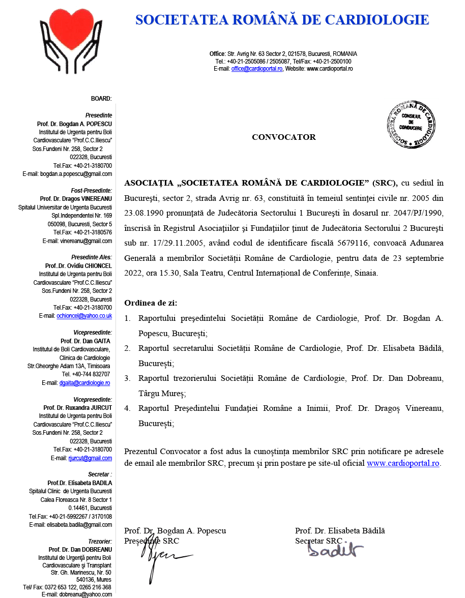 CONVOCATOR Adunarea Generală a membrilor Societății Române de Cardiologie, 23 septembrie 2022, ora 15.30