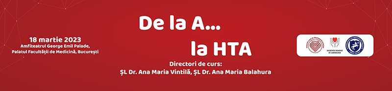 Grupul de lucru Hipertensiune Arterială al Societății Române de Cardiologie are plăcerea de a vă invita să participați la Cursul DE LA A…LA HTA ce va avea loc în data de 18 martie 2023, în format FIZIC, Amfiteatrul George Emil Palade, Palatul Facultății de Medicină din București.