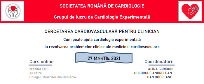 Un bun clinician vede mult mai departe și înțelege tot ce stă în spatele acestora. Grupul de lucru de Cardiologie Experimentală al Societății Române de Cardiologie are plăcerea de a vă invita să participați la Cursul Cercetarea cardiovasculară pentru clinician. Cum poate ajuta cardiologia experimentală la rezolvarea problemelor clinice ale medicinei cardiovasculare, ce va avea loc în data de 27 martie 2021, în format online.