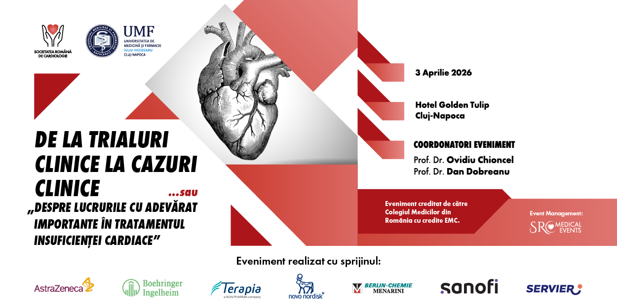 Societatea Română de Cardiologie vă invită la evenimentul De la Trialuri Clinice la Cazuri Clinice ce se va desfășura în format fizic, la Cluj Napoca, Hotel Golden Tulip, în data de 3 aprilie 2026.