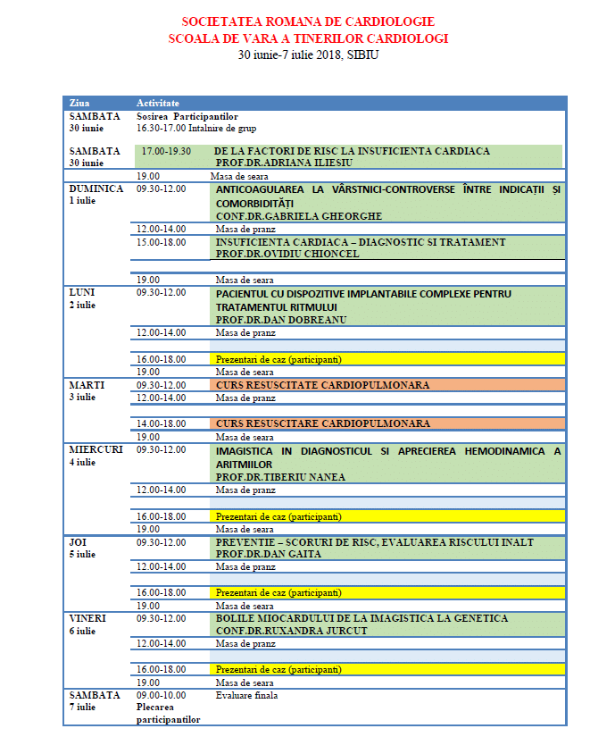 Școala de Vară a Tinerilor Cardiologi se va desfășura în perioada 30 iunie - 7 iulie 2018 la Sibiu, Cisnădioara. Programul include prelegeri, ateliere de lucru, discuții interactive pe teme de interes, cazuri clinice (prezentate de aplicanți), dar și activități sociale și recreative. Toate cheltuielile legate de transport, cazare, masa, activități educaționale, sunt acoperite de organizatori.