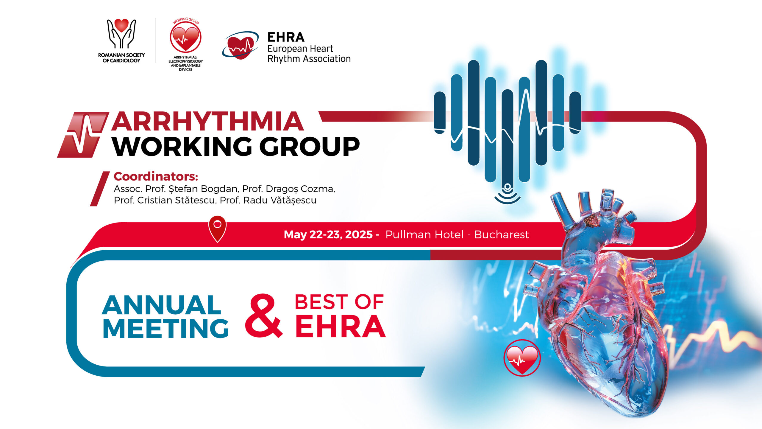 We are pleased to invite you to the "Arrhythmia Working Group Meeting and Best of EHRA" Conference. This event, organized by the Working Group of Arrhythmia within the Romanian Society of Cardiology (WGA-RSC), will take place at the Pullman Hotel in Bucharest, May 22-23, 2025.