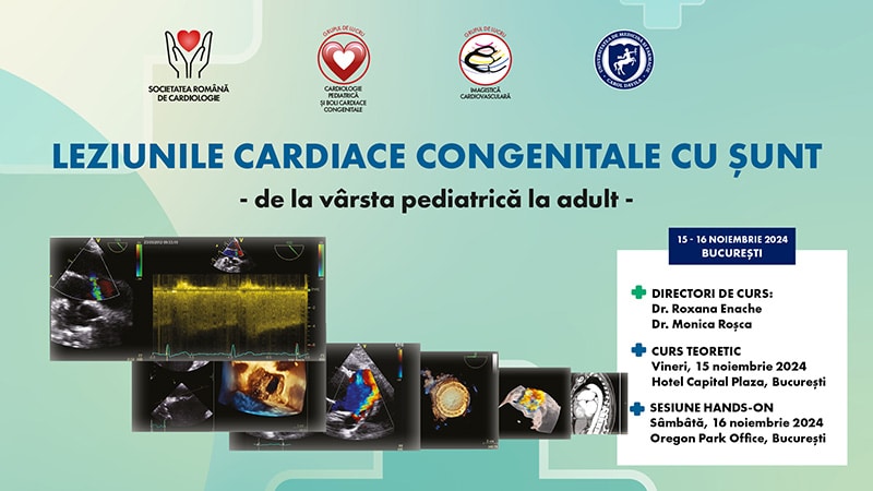Societatea Română de Cardiologie vă invită la cursul „Leziunile cardiace congenitale cu șunt- de la vârsta pediatrică la adult” ce se va desfășura în perioada 15 noiembrie- 16 noiembrie 2024 în format fizic, la București, hotelul Capital Plaza și Oregon Park Office.