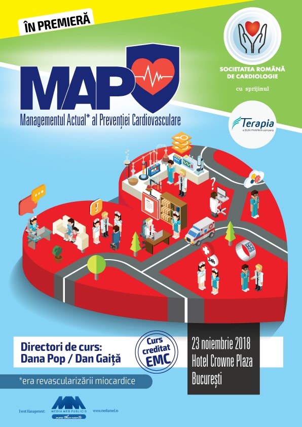 Societatea Română de Cardiologie vă invită să participați ȋn premieră la cursul MAP – Managementul Actual* ȋn Prevenţia Cardiovasculară (*era revascularizării miocardice), ce va avea loc vineri, 23 noiembrie 2018, la Hotel Crowne Plaza, începând cu ora 08.30.