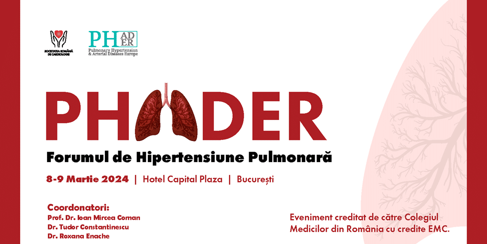 Societatea Română de Cardiologie vă invită la simpozionul „PHADER: Forumul de Hipertensiune Pulmonară” ce se va desfășura în format fizic, la București, Hotel Capital Plaza, în perioada 8-9 martie 2024.