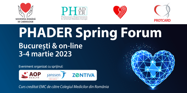 Societatea Română de Cardiologie vă invită la ”PHADER Spring Forum” ce se va desfășura în format hibrid, la București (Amfiteatrul Institutului ”Prof. Dr. C. C. Iliescu”) și online, în perioada 3-4 martie 2023.