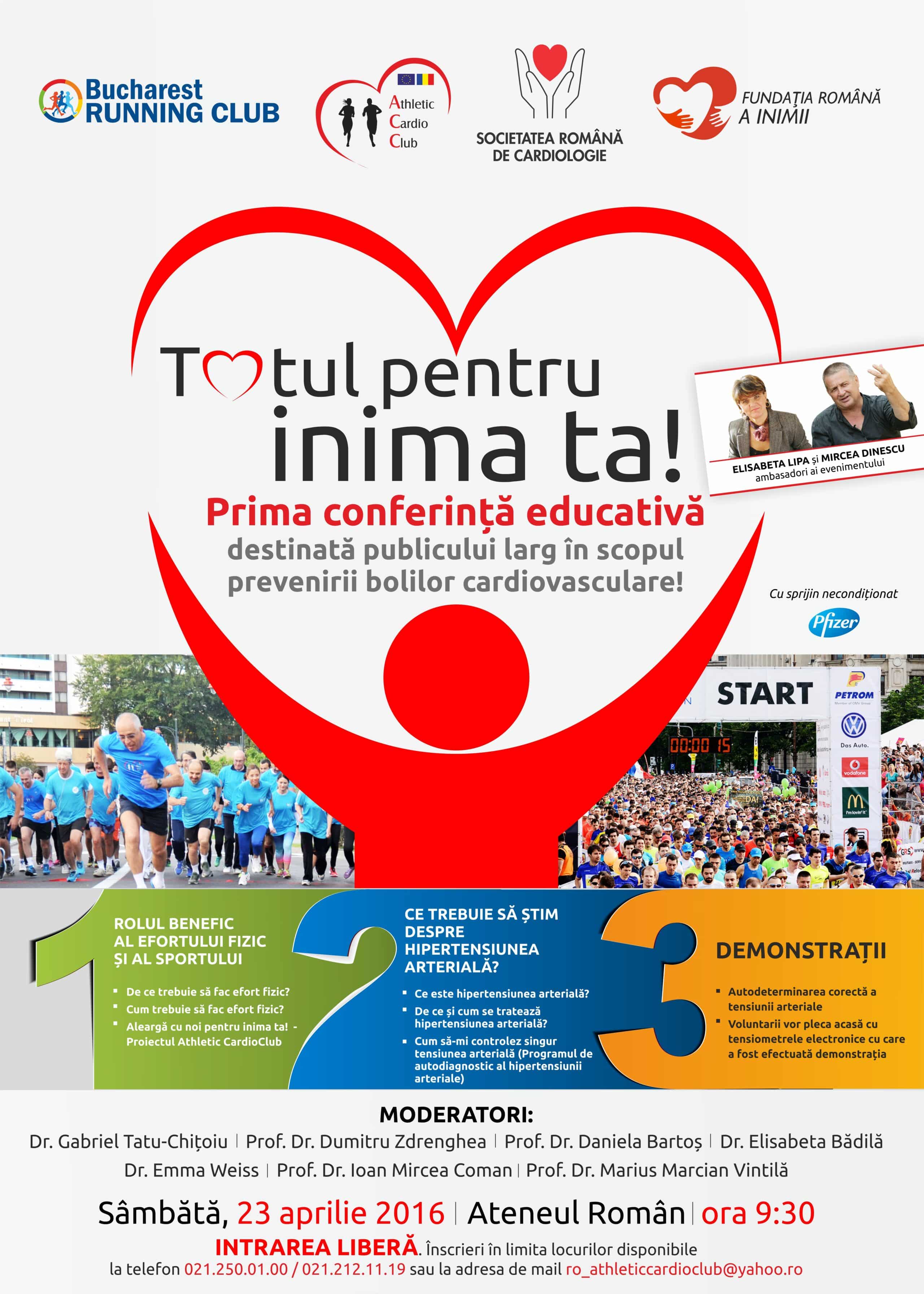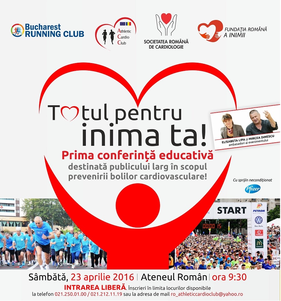 Organizata de Societatea Romana de Cardiologie, Athletic CardioClub, Fundatia Romana a Inimii si Asociatia Bucharest Running Club, la ATENEUL ROMAN, la data de 23 APRILIE 2016, incepand cu ora 9:30