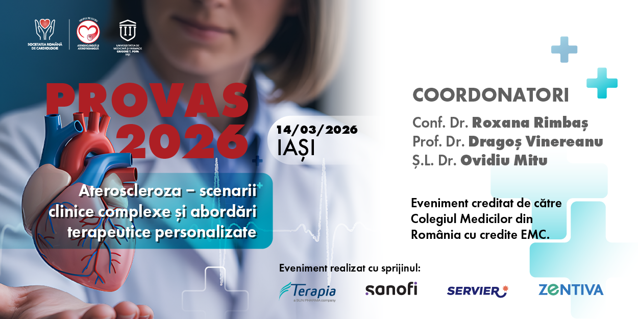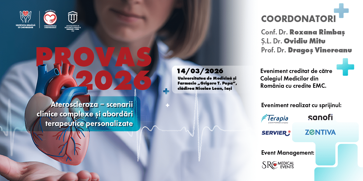 Societatea Română de Cardiologie vă invită la evenimentul „PROVAS 2026 Ateroscleroza – scenarii clinice complexe și abordări terapeutice personalizate” ce se va desfășura în format fizic, la Iași, Universitatea de Medicină și Farmacie „Grigore T. Popa”, clădirea Nicolae Leon, în data de 14 martie 2026.