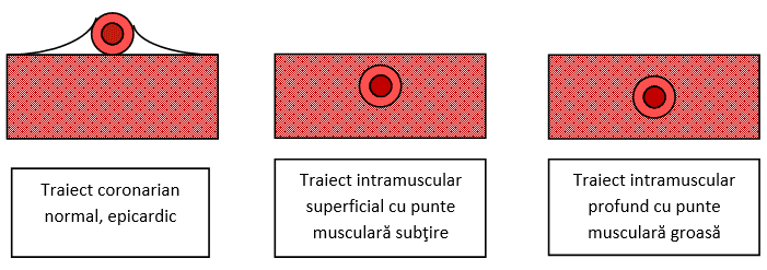 Artera coronară poziţionată epicardic, în mod normal şi intramuscular, în cazul punţii musculare. Consecinţele acestei anomalii depind de profunzimea la care se află artera în interiorul miocardului şi de lungimea porţiunii tunelizate. (după 1)