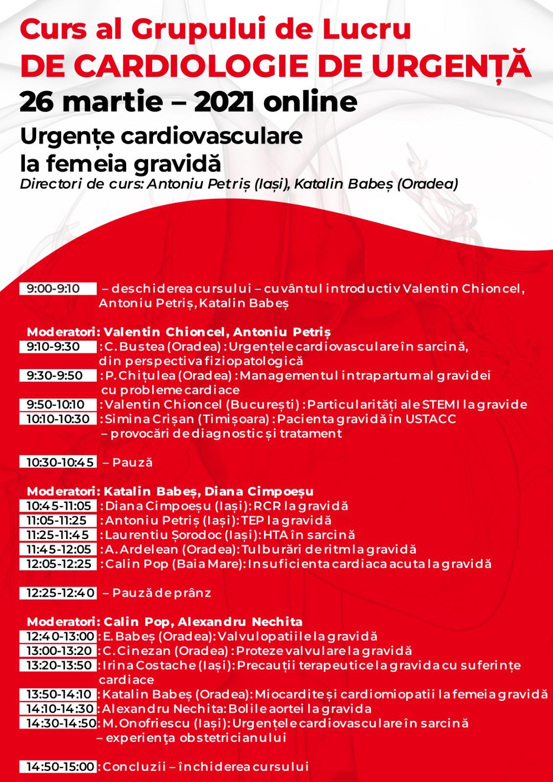 Intâlnirea noastră va fi creditată cu puncte EMC de către Colegiul Medicilor România, așa că vă așteptăm alături de noi vineri 26 martie 2021, începând cu ora 9.00, în mediul on-line, la o intâlnire de maxim interes medical adresată tuturor celor preocupați de identificarea și rezolvarea promptă și adecvată a “Urgențelor cardiovasculare la femeia gravidă”.