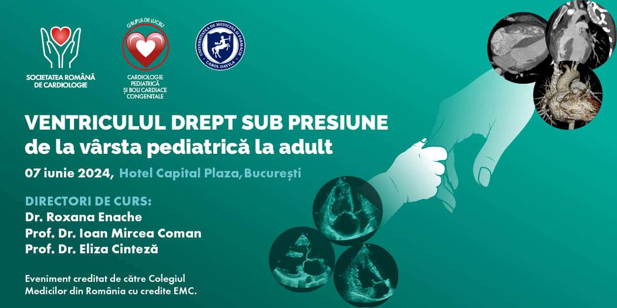 Societatea Română de Cardiologie vă invită la cursul „Ventriculul drept sub presiune - de la vârsta pediatrică la adult” ce se va desfășura în format fizic, la București, Hotel Capital Plaza, în data de 7 iunie 2024.